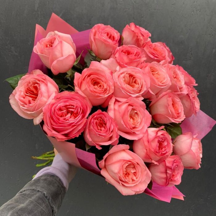 пинк экспрешн роза пионовидная – 21 шт.Упаковка дизайнерская – 2 шт.Лента атласная – 1 шт.