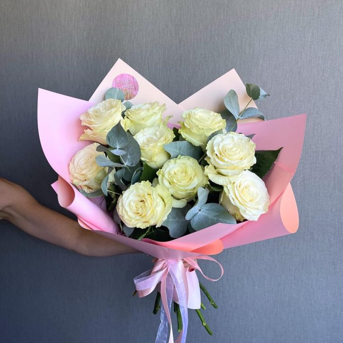 Это изысканный и стильный букет, который сочетает в себе элегантность белых роз с ароматными и декоративными листьями эвкалипта. Всегда свежие цветы. Доставка по Тбилиси бесплатная.