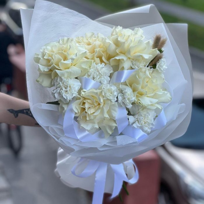 роза ажурная – 5 шт.Гвоздика сортовая – 3 шт.Гвоздика кустовая – 2 шт.Лагурус (сухоцвет) – 3 шт.Упаковка дизайнерская – 1 шт.Кризал (подкормка) – 1 шт.