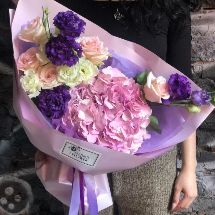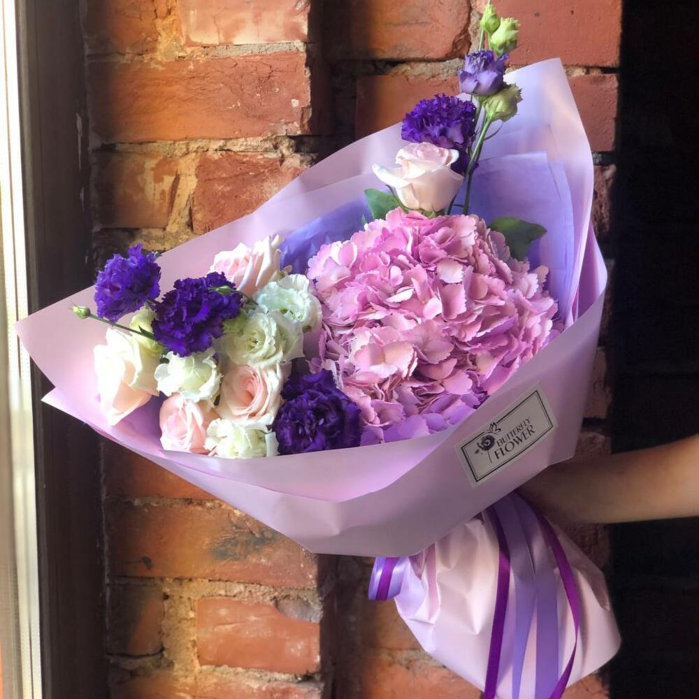 Букет из гортензии, эустомы и роз в стильной упаковке “Свет звезд”