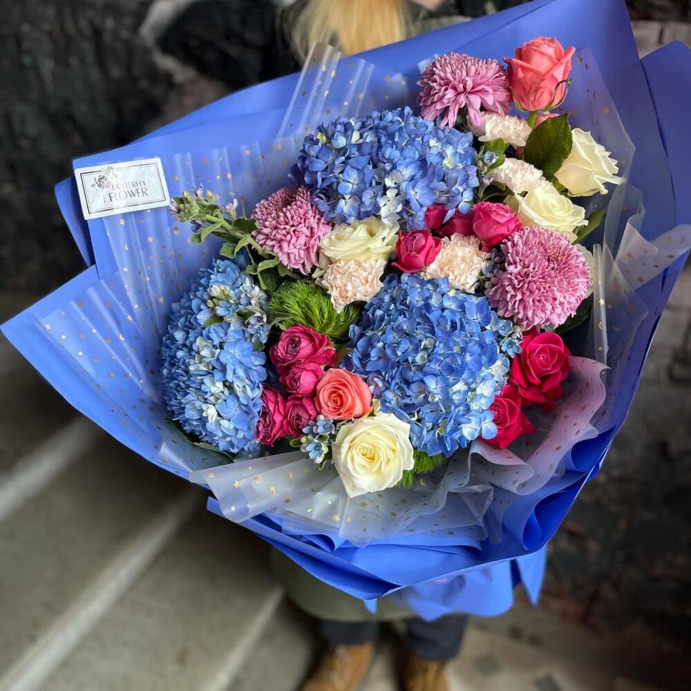 Букет из гортензии, хризантемы, гвоздики, оксипеталума и роз в стильной упаковке “Ласковый ветерок”
