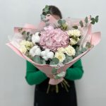 Букет с гортензией и пионовидными розами