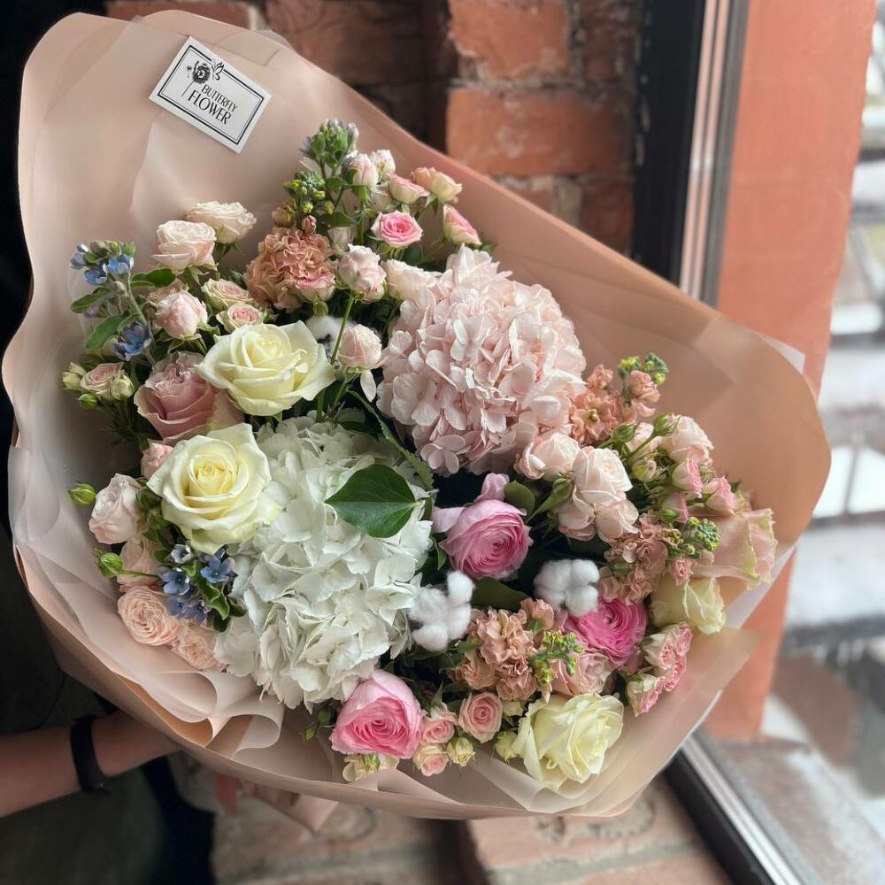 Букет из гортензии, ранункулюсов, маттиолы, хлопка, кустовых и пионовидных роз в стильной упаковке “Ласковое солнце”
