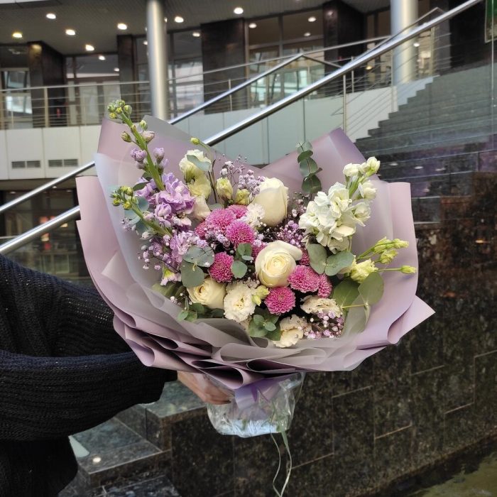 Маттиола – 3 шт.Хризантема кустовая – 2 шт.Лизиантус – 2 шт.Роза – 1 шт.Гипсофила – 1 шт.Эвкалипт – 1 шт.Лента – 2 шт.Упаковка дизайнерская – 2 шт.