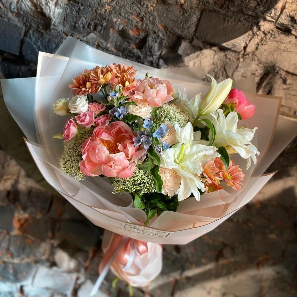 Пион – 3 шт.Трахелиум – 3 шт.Роза кустовая – 1 шт.Гвоздика – 3 шт.Эустома – 1 шт.Лента – 2 шт.Фисташка – 3 шт.Твидия – 2 шт.Упаковка – 2 шт.Хризантема кустовая – 2 шт.Лилия махровая – 1 шт.