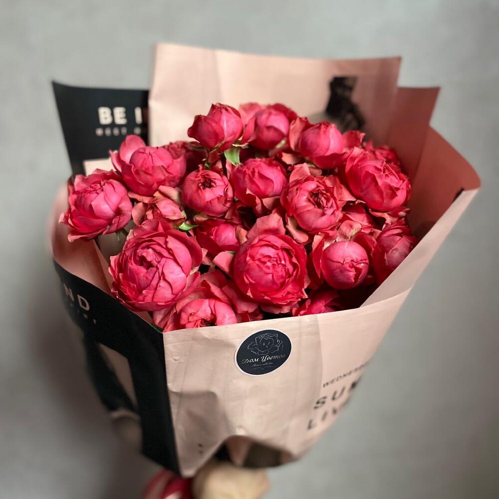 Кустовая пионовидная роза – 5 шт.декоративная упаковка – 2 шт.Атласная лента – 1 шт.