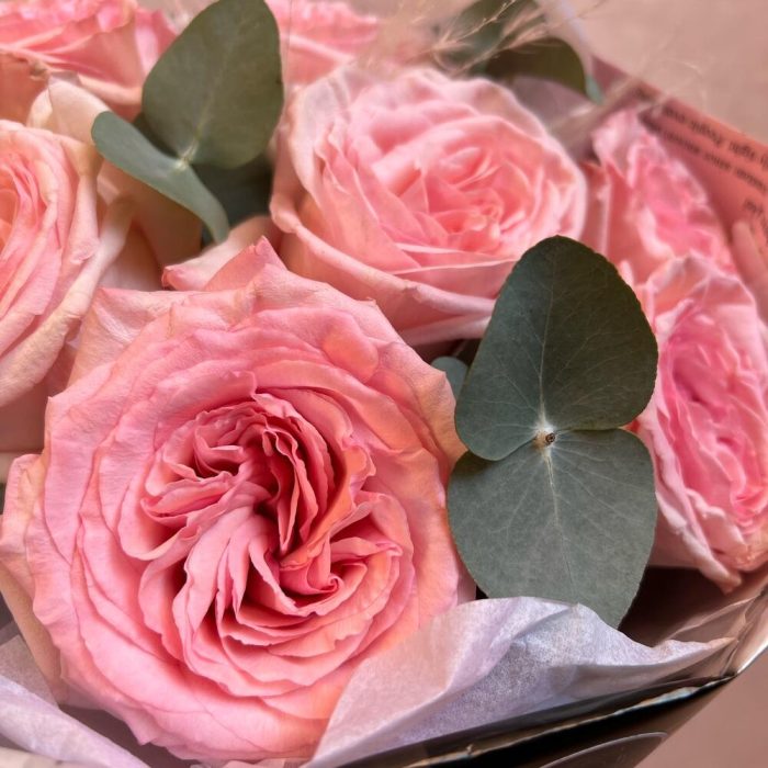 Эвкалипт – 5 шт.Сухоцветы – 1 шт.Пионовидная роза – 7 шт.Атласная лента – 1 шт.декоративная упаковка – 1 шт.