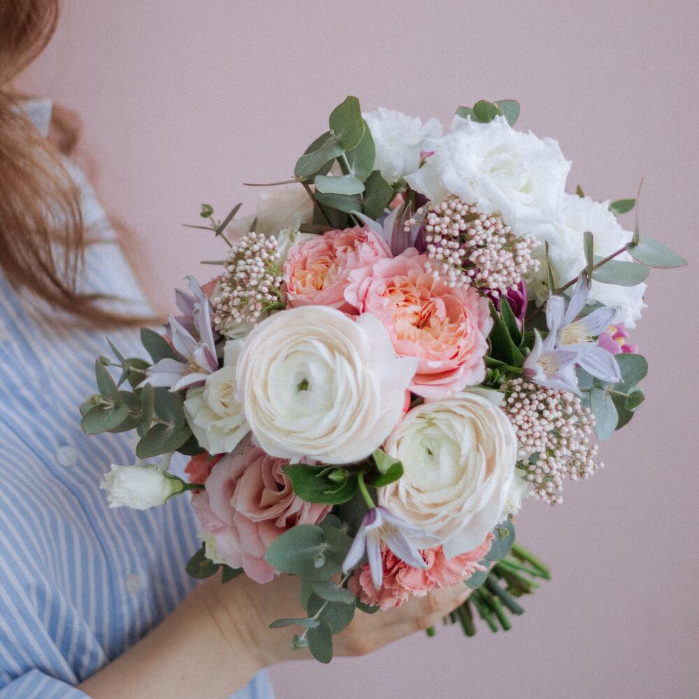 Роза кустовая пионовидная – 2 шт.роза куст – 2 шт.Лизиантус – 3 шт.Роза – 2 шт.эвкаалипт – 4 шт.Ранункулюс – 2 шт.