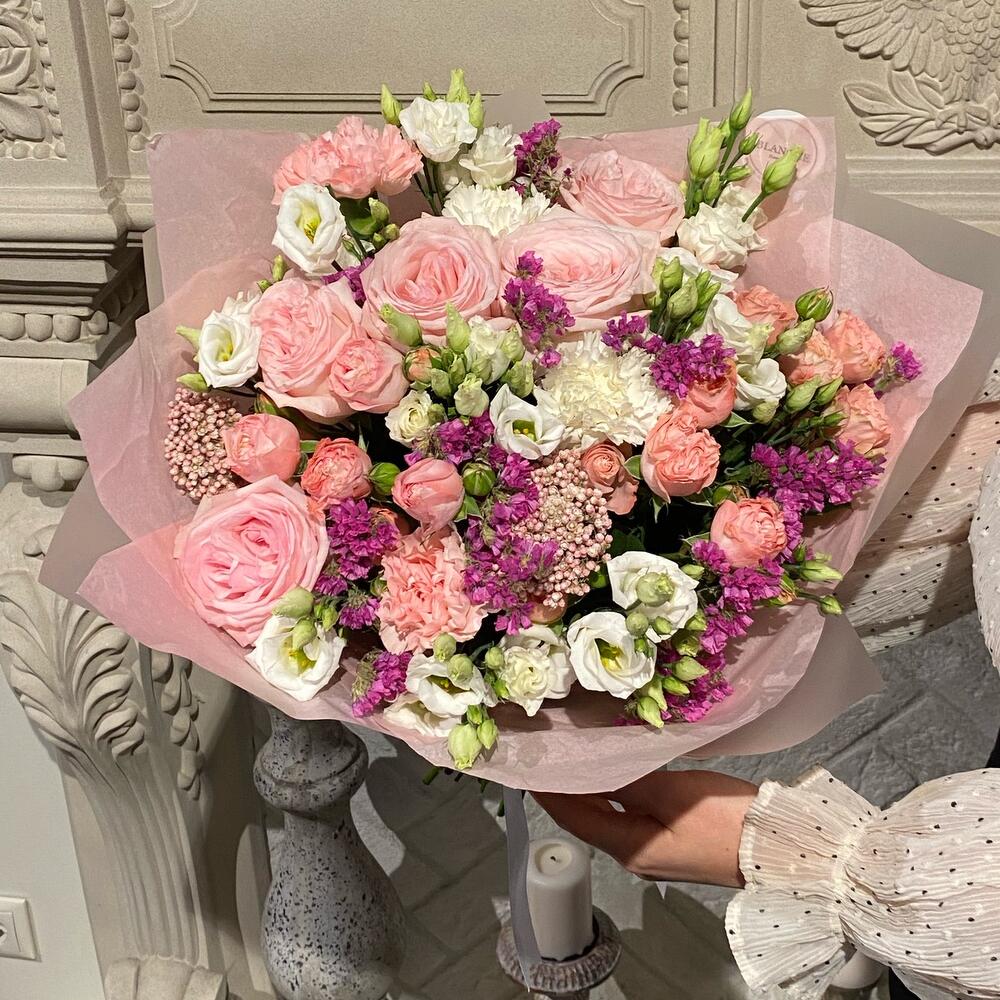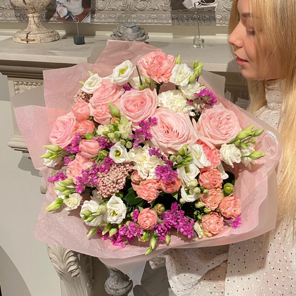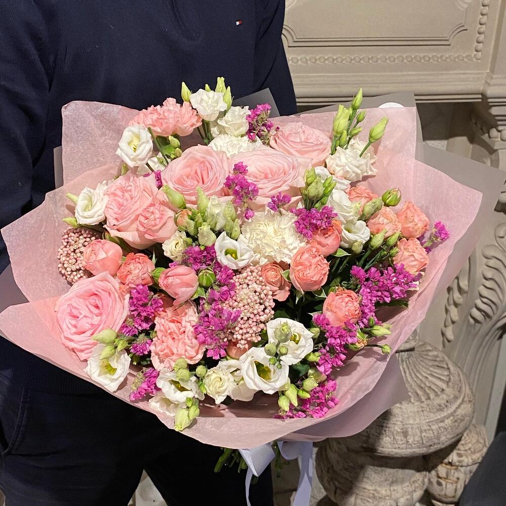 Озотамнус – 2 шт.Статица – 5 шт.Эустома – 5 шт.Фирменная упаковка – 1 шт.диантусы – 5 шт.madam bombastic – 3 шт.pink o’hara роза – 5 шт.