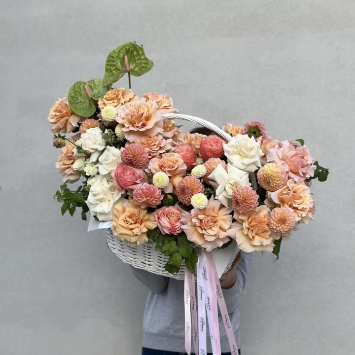 Антуриум – 2 шт. Гортензия – 1 шт. Корзина – 1 шт. Роза – 35 шт. Гвоздика – 1 шт. Очиток – 5 шт. Ветки малины – 7 шт. георгины – 28 шт. спрей-роза – 7 шт.
