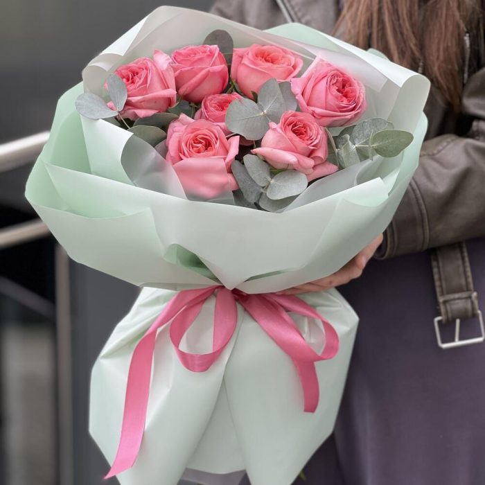 Эвкалипт – 2 шт. Оформление – 1 шт. роза пинк экспрешен – 7 шт.