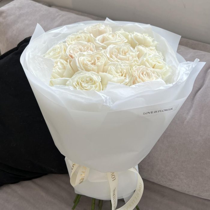 Роза белая – 15 шт.тишью белая хрустящая – 1 шт.пленка матовая белая полупрозрачная – 1 шт.открытка брендированная в подарок – 1 шт.