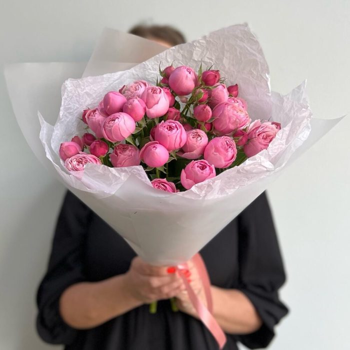 Лента атласная – 1 шт.Пионовидная кустовая роза – 3 шт.Пленка матовая – 2 шт.Тишью белое – 2 шт.