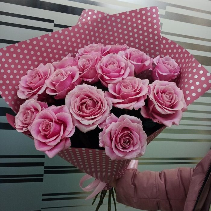 роза россия розовая 70 см – 15 шт.Упаковка дизайнерская – 3 шт.Лента атласная – 1 шт.