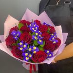 Ирис – 12 шт.Лента – 1 шт.Роза – 13 шт.Зелень – 10 шт.Упаковка – 1 шт.
