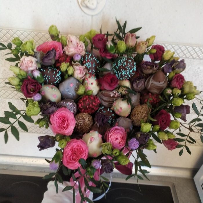Роза кустовая – 2 шт.эустома фиолетовая – 3 шт.Упаковка дизайнерская – 1 шт.Коробка сердце – 1 шт.эустома розовая – 3 шт.Фисташка пучок – 2 шт.Клубника в шоколаде callebaut (бельгия) – 25 шт.Губка флористическая – 1 шт.ленты атласные – 3 шт.пленка траспортировочная – 1 шт.