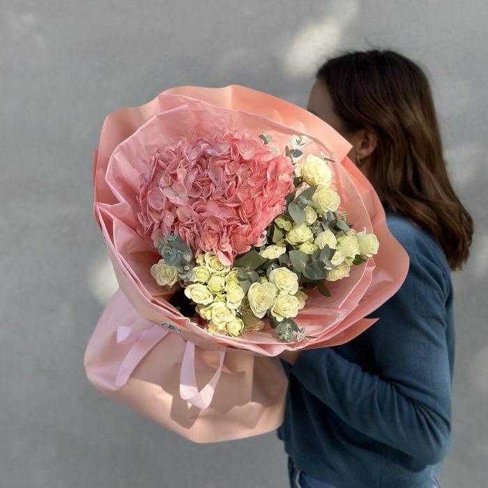 Изысканный букет из гортензии и спрей роз в нескольких оттенках.