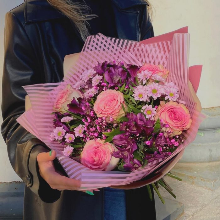 Роза премиум – 5 шт.Альстромерия – 3 шт.Хризантема кустовая – 3 шт.Фисташка пучок – 1 шт.Упаковка – 2 шт.Лента – 1 шт.