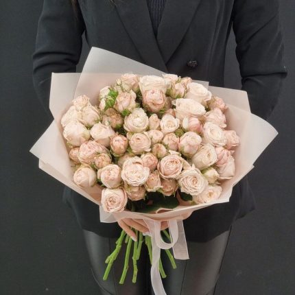Кустовая роза пионовидная – 101 шт. Открыточка с вашими пожеланиями – 1 шт. Атласная лента – 1 шт.