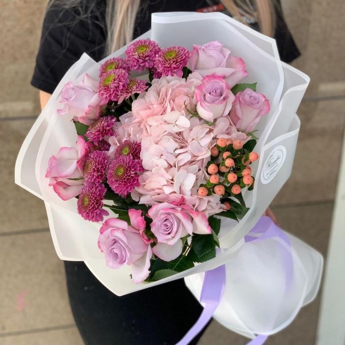 Альстромерии, Гортензии, Кустовые розы, Лизиантусы, Розы, Хризантемы