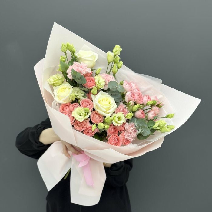 Авторский букет "Маленькая нежность": пионовидная роза, нежная гвоздика и ароматная маттиола
