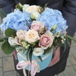 Шляпная коробка 20см, Флористическая губка (Оазис), Целлофан , Лента атласная, Гортензия, Роза эквадорская MIX 60см, Эустома белая, Кустовая роза Жустин (Justine), Хамелациум белый, Эвкалипт цинерея, Эвкалипт парвифолия (PARVIFOLIA)