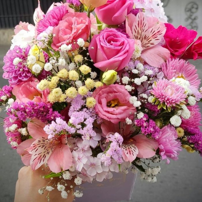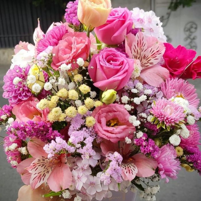Роза – 4 шт. хризантемы – 8 шт. Гипсофила – 3 шт. Альстромерия – 8 шт.