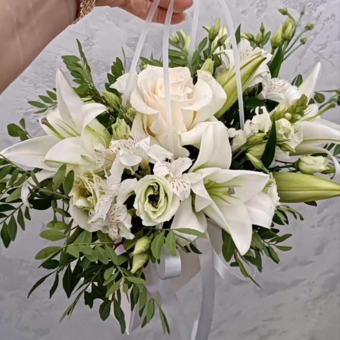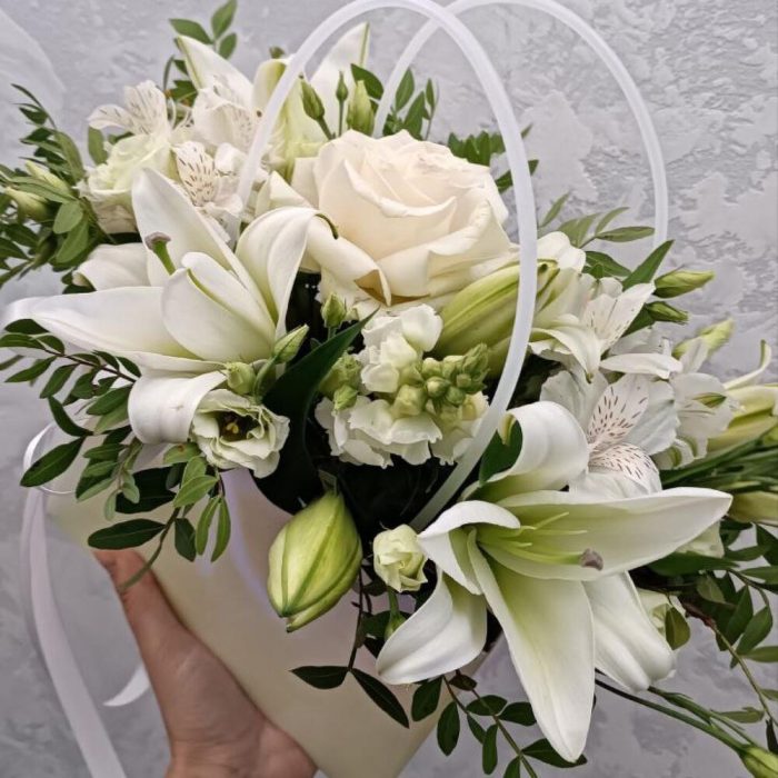 Альстромерия – 3 шт. Лилия – 1 шт. Писташ – 5 шт. Роза Эквадор – 1 шт. эустома белая – 3 шт. анирринум белый – 3 шт.