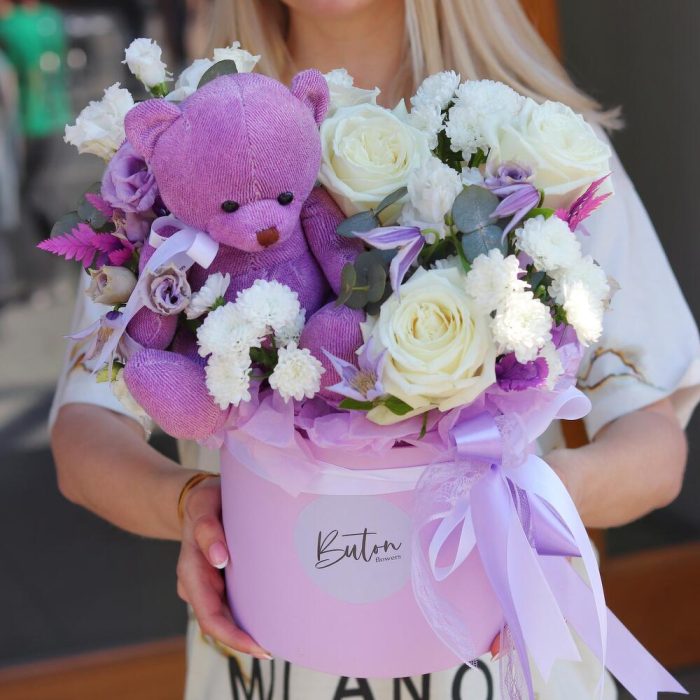 Нежная, чувственная и воздушная композиция с мишкой, выполненная из пионовидных роз, лизиантуса, клематиса, сантини и других не менее интересных цветов.А сиреневый мишка, который входит в состав композиции, сделает Ваш цветочный подарок ещё более уникальным и индивидуальным!Такая композиция точно понравится яркой и энергичной получательнице, и будет долго радовать её.К композиции прилагается открытка с вашими пожеланиями и приятный комплимент от нашего магазина – шоколадка.Мы также будем рады отправить вместе с композицией конфеты, шоколад ручной работы или б/а вино по вашим пожеланиям, просто напишите нам в личные сообщения. Заказывая нашу композицию, Вы всегда получите исключительный сервис и заботу о клиенте