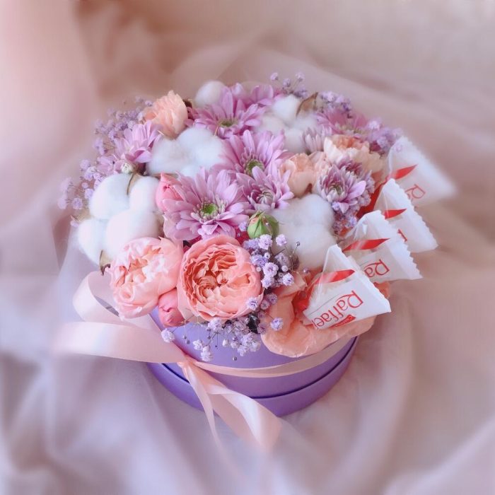 Гипсофила – 1 шт.Хлопок – 5 шт.Хризантема кустовая – 1 шт.Диантус – 3 шт.Коробка шляпная – 1 шт.Конфеты Raffaello – 4 шт.Пионовидная роза джульетта – 1 шт.инструкция по уходу за цветами – 1 шт.любовь флориста – 1 шт.