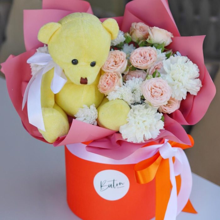 Цветы в яркой коробке с мишкой