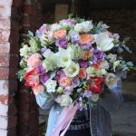 Лейка с цветами: пионовидные розы, маттиола, эустома