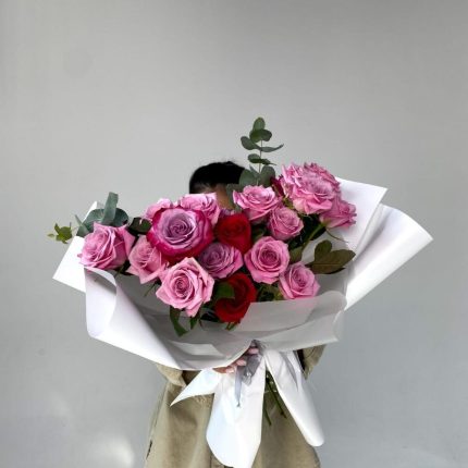 Роза голландская 60 см – 3 шт. Хризантема кустовая – 2 шт. Ваксфлауэр – 1 шт. Эвкалипт – 2 шт.