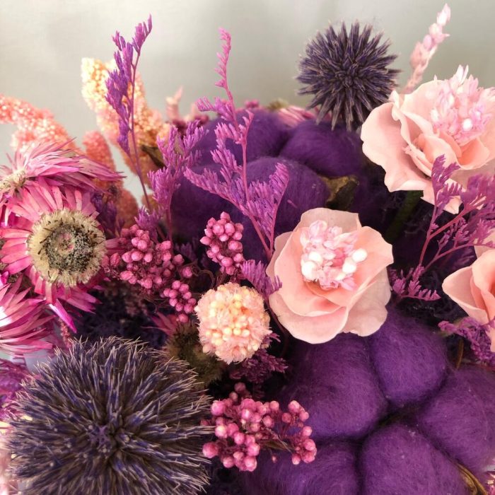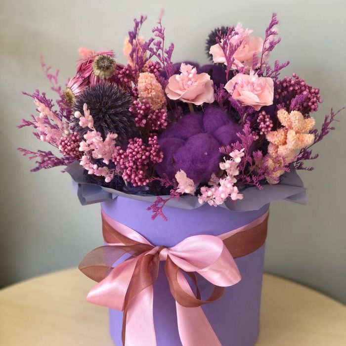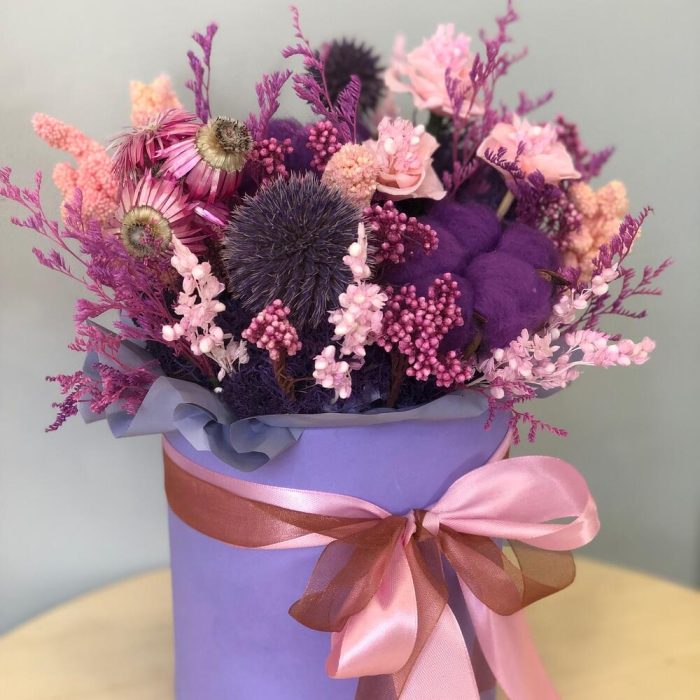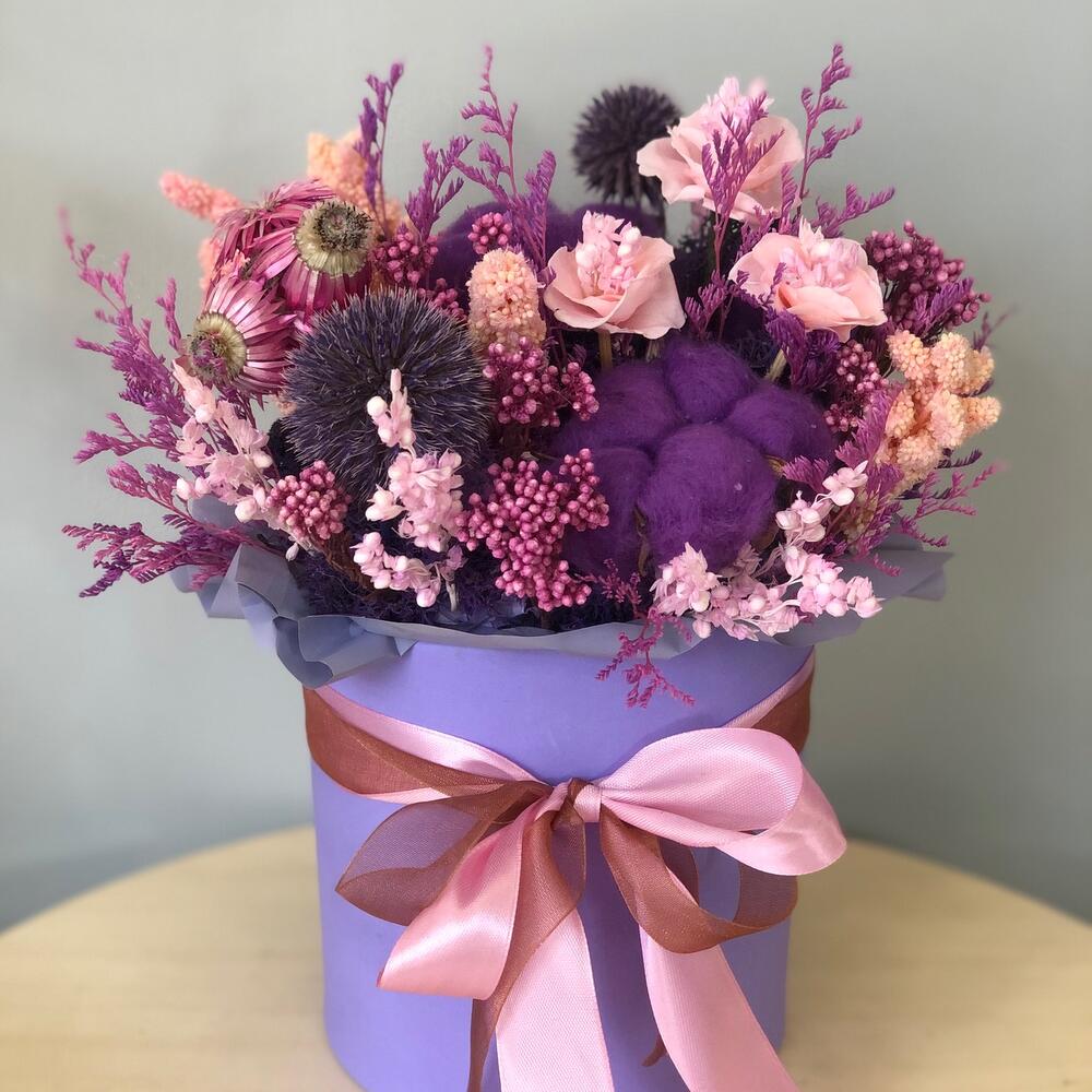 Шляпная коробка – 1 шт.Хлопок – 3 шт.Гелихризум – 1 шт.Эхинопс – 2 шт.сорго – 1 шт.Озотамнус – 1 шт.Лимониум – 1 шт.Роза стабилизированная – 1 шт.Сетария – 2 шт.