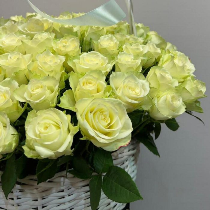 Роза белая – 101 шт.Корзина плетеная – 1 шт.Оазис флористический – 4 шт.Лента атласная – 1 шт.
