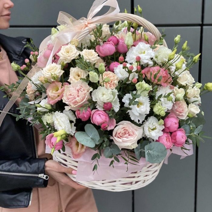 Эустома – 10 шт. роза розовая пинк мондиаль – 9 шт. Эвкалипт – 3 шт. Гиперикум – 5 шт. Гвоздика – 7 шт. кустовая роза таня – 5 шт. кустовая роза роял порцелина – 5 шт. кустовая пионовидная роза сильвия пинк – 8 шт. Корзина – 1 шт. Оазис – 6 шт. Оформление – 1 шт.