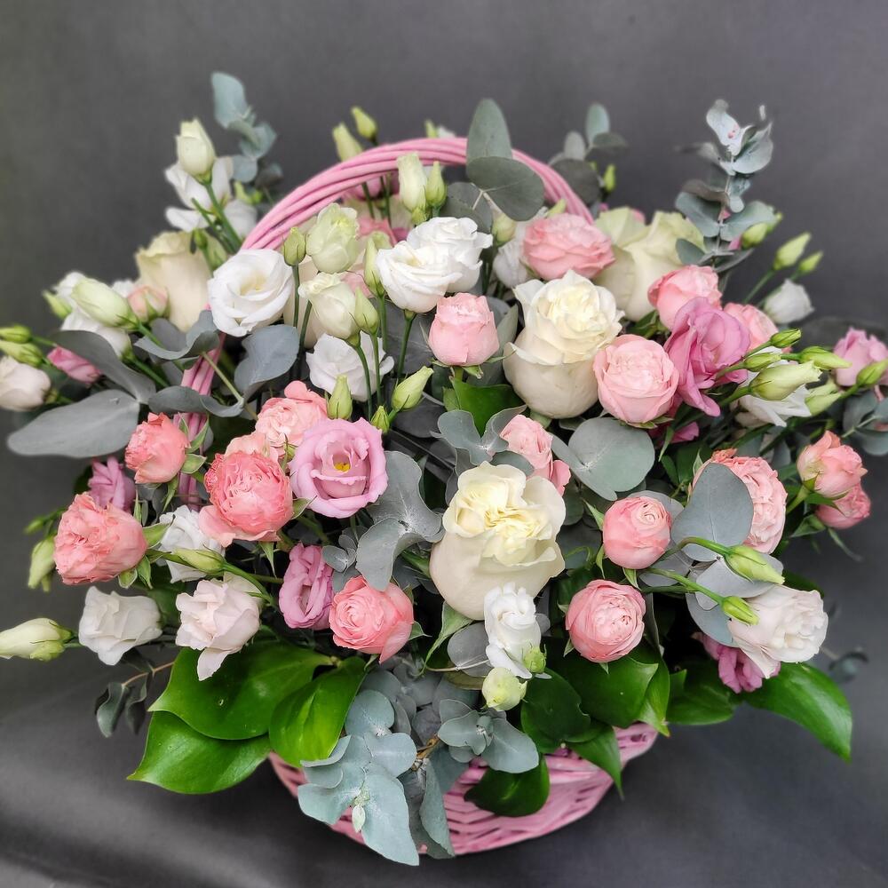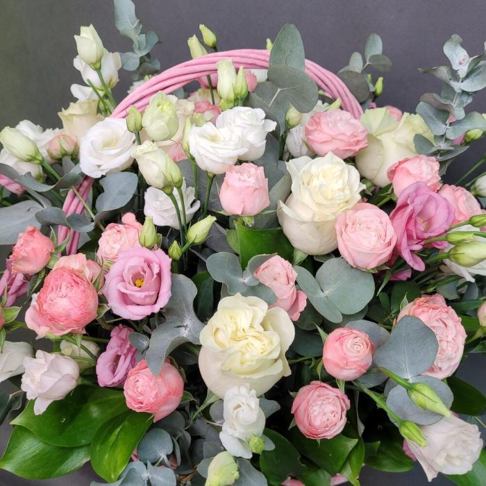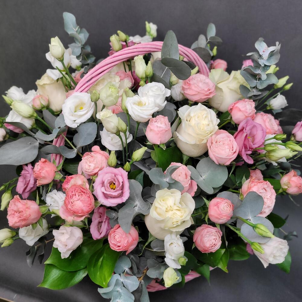 Роза Эквадор – 7 шт.Роза кустовая пионовидная – 7 шт.Лизиантус – 7 шт.Рускус – 10 шт.Эвкалипт – 5 шт.Эвкалипт Baby Blue – 2 шт.Оазис флористический – 2 шт.Корзина большая – 1 шт.