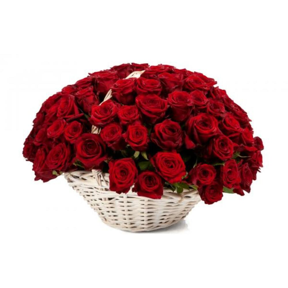 роза красного цвета 60 см – 51 шт.Корзина маленькая – 1 шт.доставка – 2 шт.