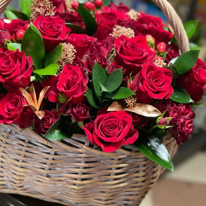 Роза Эквадор – 25 шт. Роза кустовая – 10 шт. Скиммия – 10 шт. Гиперикум красный КУСТОВОЙ – 5 шт. Писташ – 10 шт.