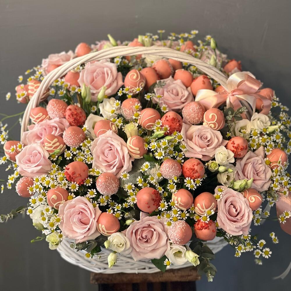 Эвкалипт – 11 шт.Ромашка – 11 шт.Лента атласная – 2 шт.Роза розовая – 17 шт.Корзина плетеная – 1 шт.Клубника в шоколаде – 36 шт.