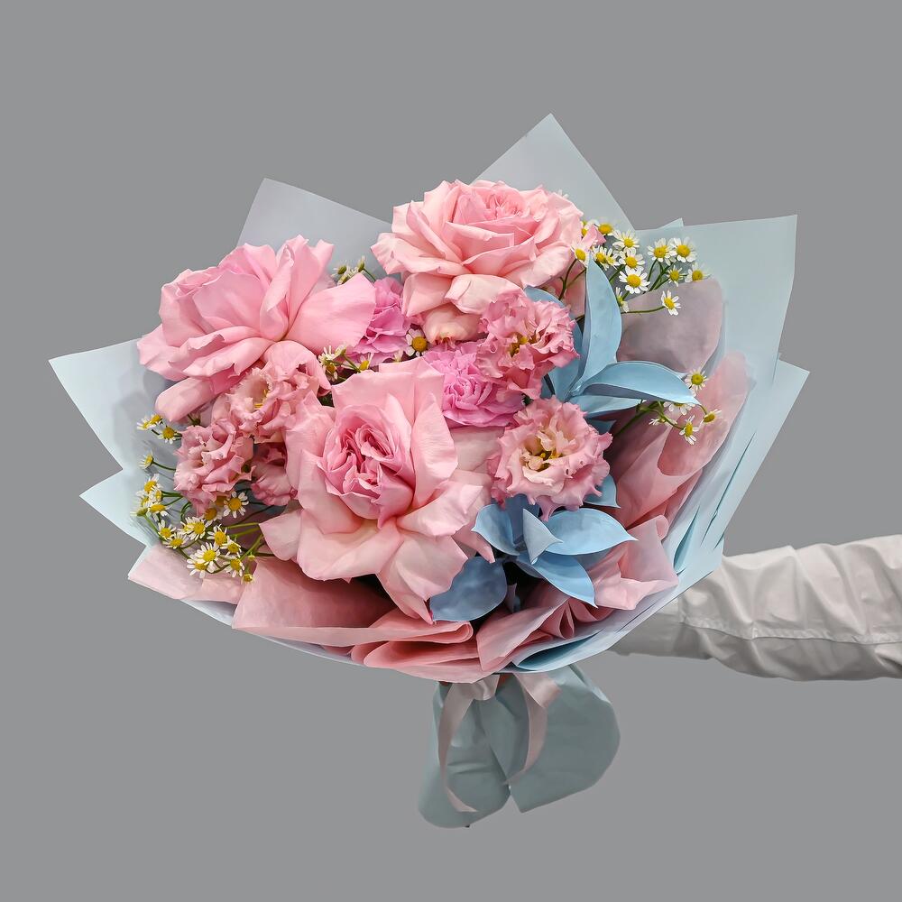 Категории: Гвоздики, Лизиантусы, Розы, Ромашки
