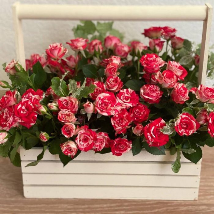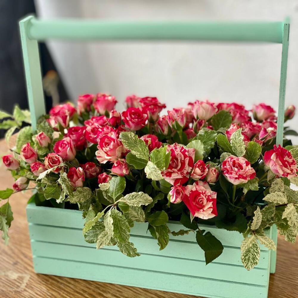 Роза кустовая – 15 шт.Эвкалипт – 4 шт.Лента атласная – 2 шт.Ящик деревянный – 1 шт.Оазис флористический – 1 шт.