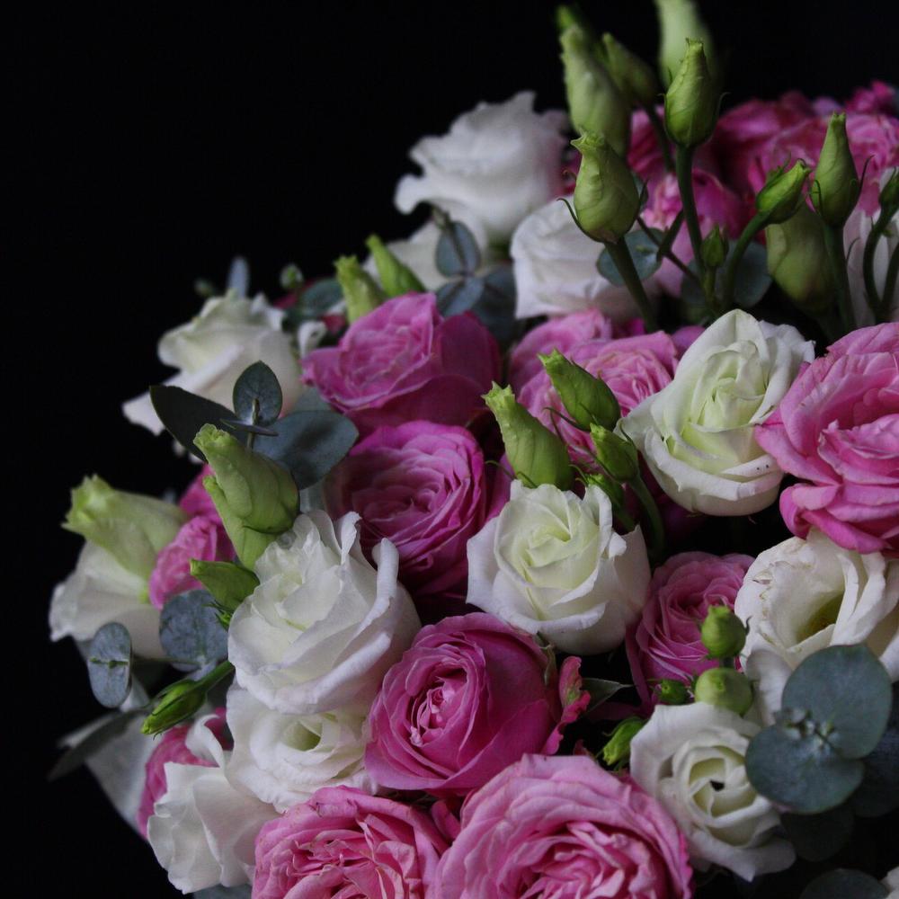 Пионовидная кустовая роза – 7 шт.эустома белая – 5 шт.Коробка шляпная – 1 шт.Оазис флористический – 1 шт.Эвкалипт Baby Blue – 5 шт.Лента атласная – 3 шт.