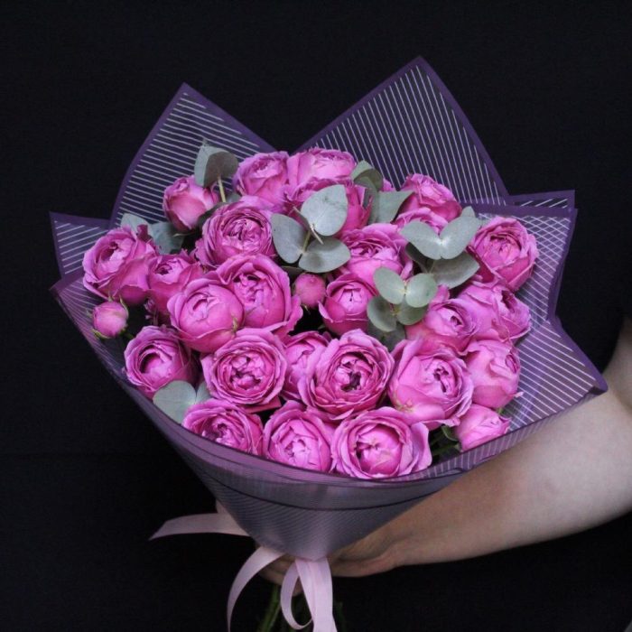 mono bouquet 52 из 9 кустовых пионовидных роз сорта Misty bubbles с эвкалиптом