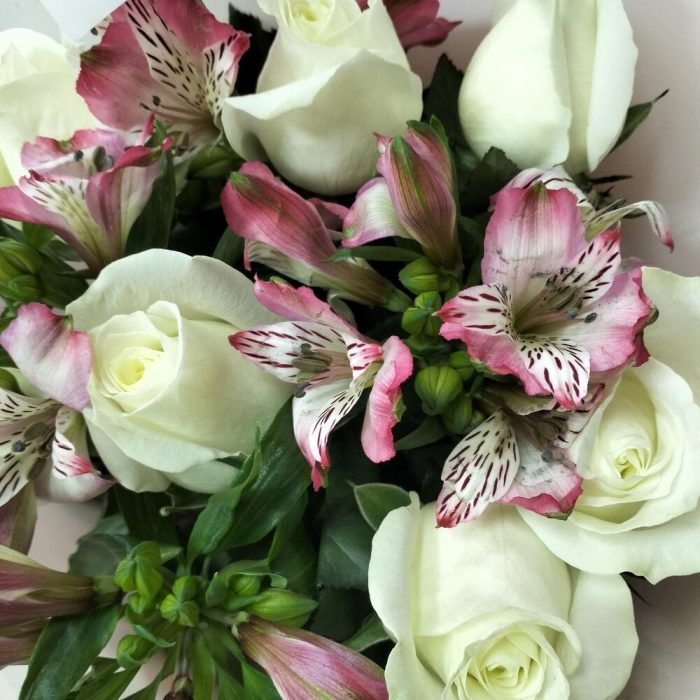 Упаковка – 2 млЛента атласная – 1 шт.Альстромерия Микс Европа – 3 шт.роза 65 см – 7 шт.