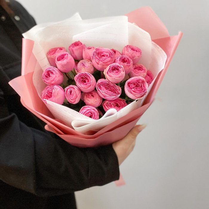Роза пионовидная кустовая – 5 шт.Упаковка дизайнерская – 2 шт.Лента атласная – 1 шт.
