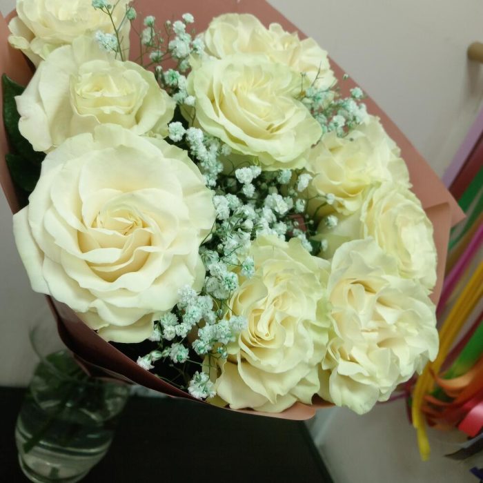 Роза эквадор 80 см – 9 шт.Гипсофила – 1 шт.Упаковка – 1 шт.
