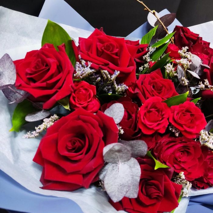 Лимониум – 3 шт.Роза кустовая – 4 шт.Рускус – 15 шт.Роза – 9 шт.Роза Кенийская – 6 шт.эвкалипта – 6 шт.Упаковка дизайнерская – 1 шт.Лента атласная – 3 шт.