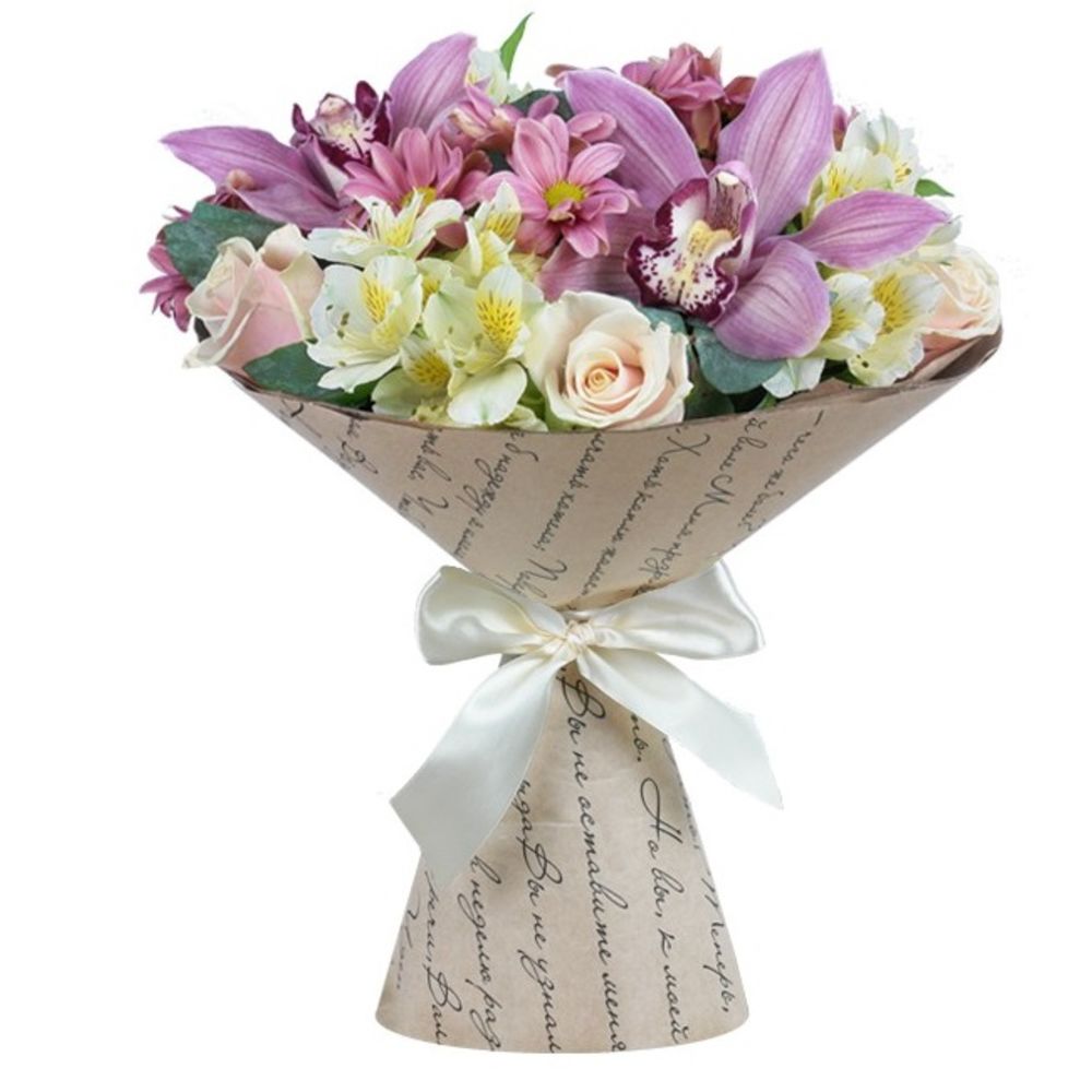 лента декоративная – 1 шт.бумага упаковочная – 1 шт.Эвкалипт – 1 шт.Цимбидиум розовый – 2 шт.Хризантема кустовая розовая – 3 шт.Роза кремовая – 5 шт.Альстромерия кремовая – 4 шт.