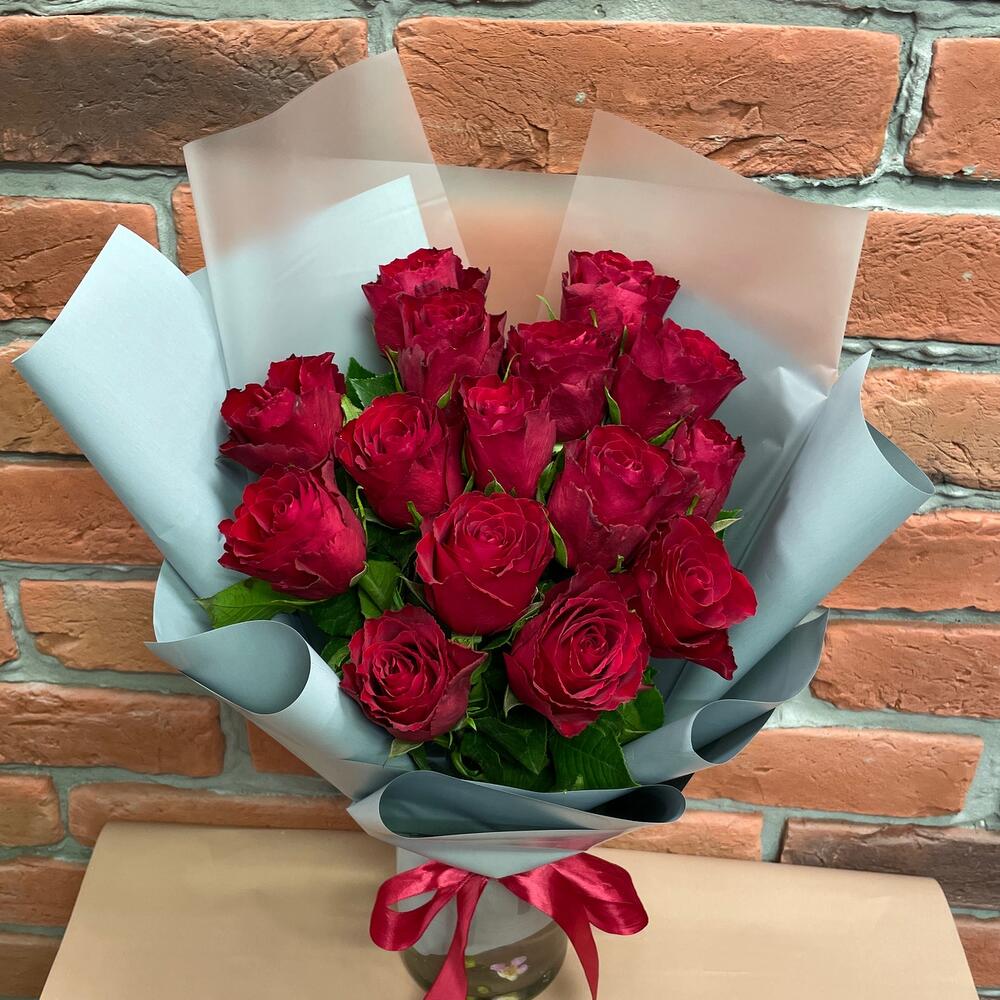 Роза красная – 15 шт.Упаковка дизайнерская – 1 шт.Лента атласная – 1 шт.